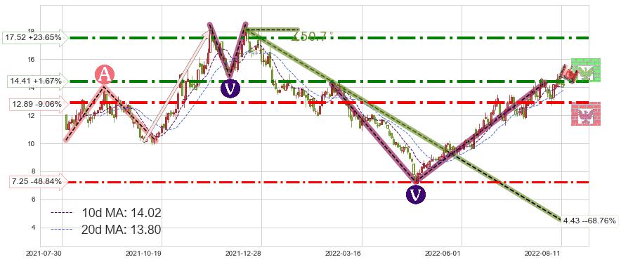 ♘ 阻力价格位14.41,可信任强度81.80%,距离最后交易2022-08-12形成的收盘价格14.17相差 +1.67%