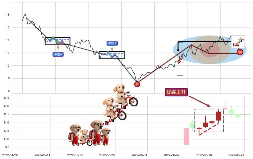 ➢ 【中枢A】:2022-01-13-2022-01-27,中枢由5笔构成,共11交易日, ZG=13.89, ZD=13.89