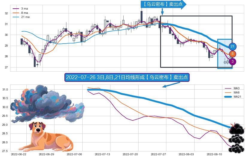 ⚀ 2022-07-07日-2022-08-12日显现 3日-8日-21日均线 【乌云密布】卖出点 看空信号,后市看跌,卖出