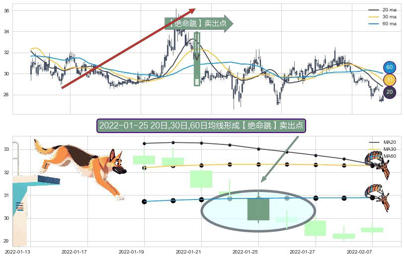 ⚀ 2022-01-25日显现 20日-30日-60日均线 【绝命跳】卖出点 看空信号,后市看跌,卖出
