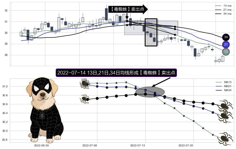 ⚀ 2022-07-14日显现 13日-21日-34日均线 【毒蜘蛛】卖出点 看空信号,后市看跌,卖出