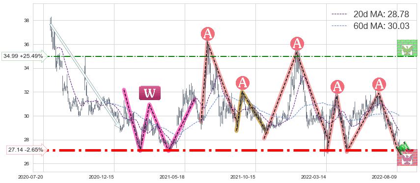 ♘ 支撑价格位27.14,可信任强度86.46%,距离最后交易2022-08-12形成的收盘价格27.88相差 -2.65%