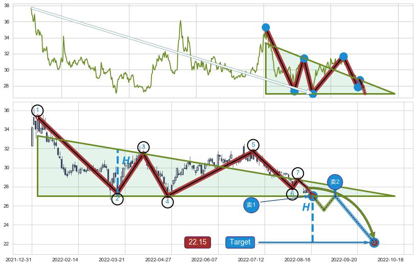 ➣ 【未确认突破,预测即将形成突破】下降三角形整理起点:2022-01-06, 预测突破点:2022-08-17,形态共149交易日