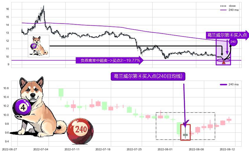形态多维评估: ⚀ 2022-08-03-日显现 葛兰威尔均线 240日均线 第④买入点 下降趋势均值回复的短线反弹信号,后市看涨,买进信号