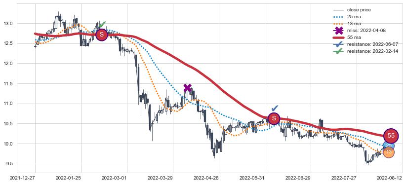 下跌趋势2021-12-27-2022-08-12,均线55确认关键阻力2处