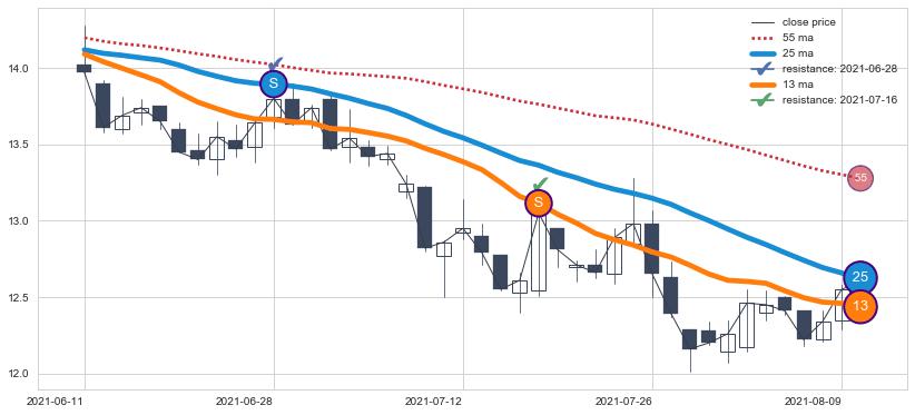 下跌趋势2021-06-11-2021-08-10,均线25, 13确认关键阻力2处
