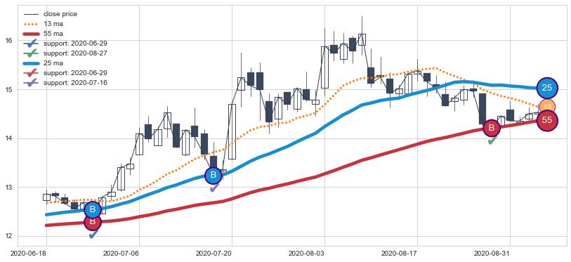 上涨趋势2020-06-18-2020-09-03,均线25, 55确认关键支撑3处