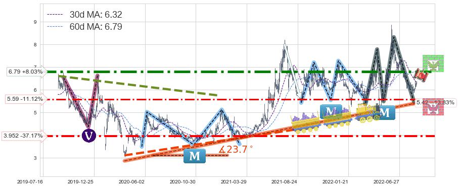 ♞ 30日均线:6.32,60日均线:6.79→ 快线<慢线