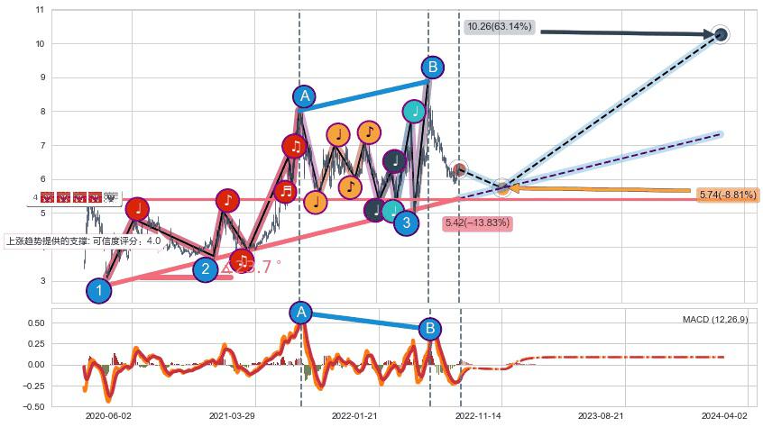 ♞ 延续前期上涨趋势提供的关键价格位有1个:5.42,将对后续走势提供一定支撑