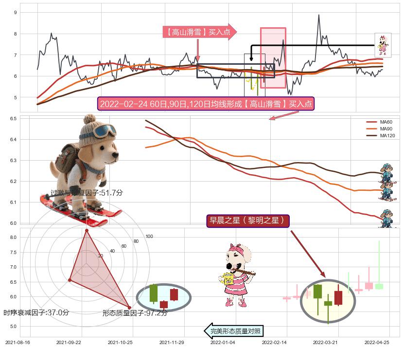 | 4 🅚:【高山滑雪】买入点 ➕ 📐:降旗形向上突破击穿阻力位, 猜想持续拉升上涨,被突破的阻力位已变为支撑位 ☞ 看多信号 ⇥ 【均线】交织【图形】⇥ 综合量化分数: 62 | > |