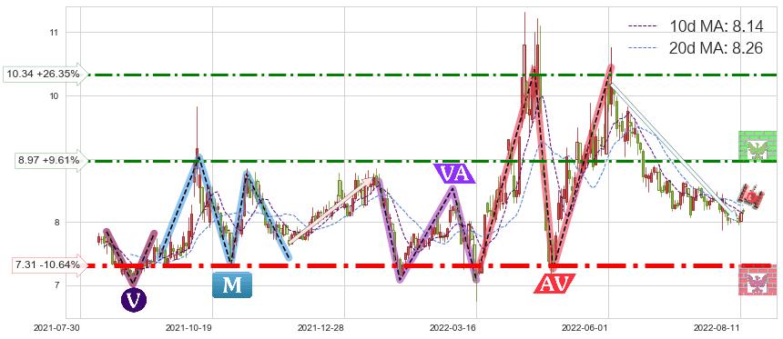 ♘ 阻力价格位8.97,可信任强度62.82%,距离最后交易2022-08-12形成的收盘价格8.18相差 +9.61%