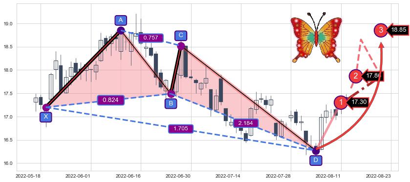 ➣ 已完成【蝴蝶】形态起点X: 2022-05-19, 终点D: 2022-08-04, 共55交易日