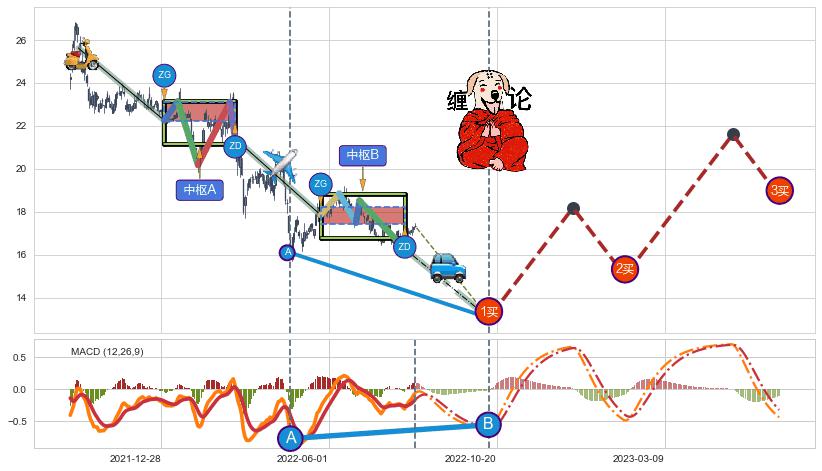 ➢ 【中枢A】:2021-12-30-2022-03-08,中枢由5笔构成,共43交易日, ZG=23.11, ZD=22.25