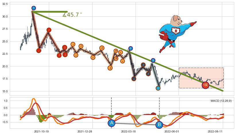 ⚔️ 2021-09-13-2022-05-11下跌趋势存在反转上涨[机会],其原下跌趋势的阻力位(15.06)已被突破[强支撑信号],原下跌趋势角度: 45.7˚
