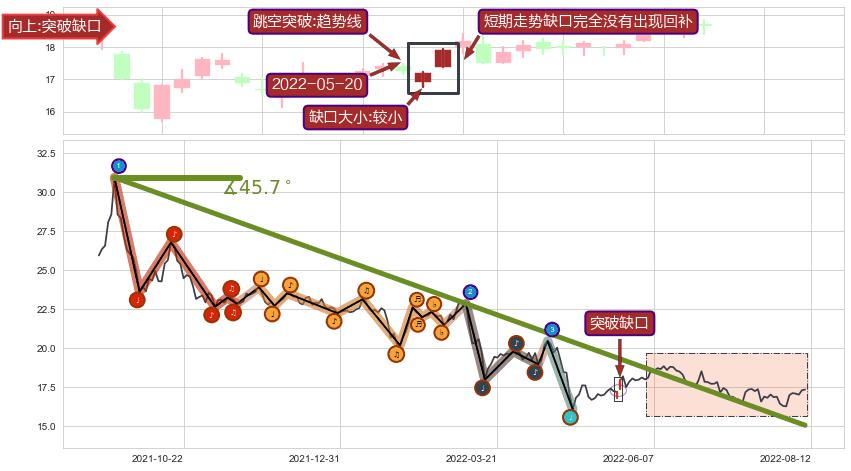 ➣ 2021-09-13-2022-05-11下跌趋势存在反转上涨[机会],其原下跌趋势的阻力位(15.06)已被突破[强支撑信号],原下跌趋势角度: 45.7˚