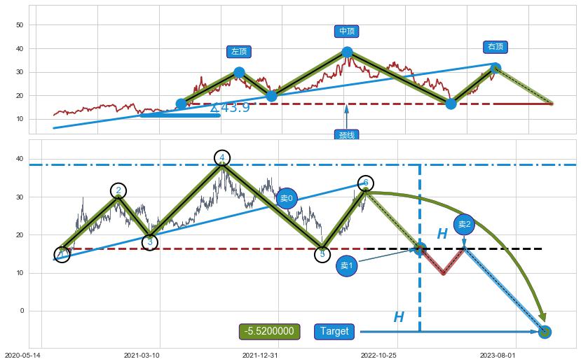➢ 最小反转跌幅→𝐇: 21.99 (三重顶波峰高点到两个波谷连线的垂直距离)