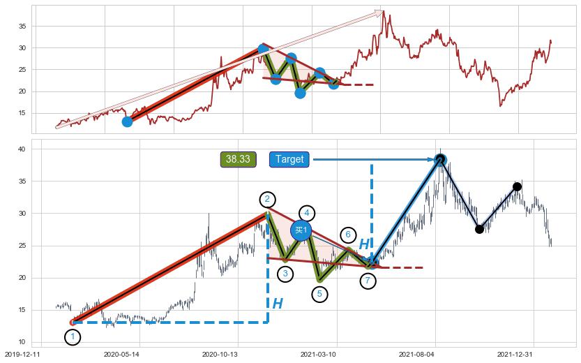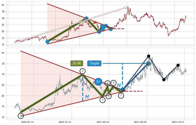 ➢ 最小中继整理涨幅→𝐇: 16.79 (𝐇楔型旗杆的长度:楔型起点→顶点)