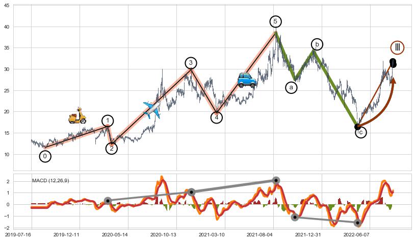 ➣ a,c调整浪MACD, RSI, KDJ走势都【未出现】背离,abc走势延续, 5浪反转概率增强