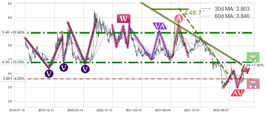 ♘ 阻力价格位4.39,可信任强度88.71%,距离最后交易2022-08-12形成的收盘价格3.970相差 +10.70%