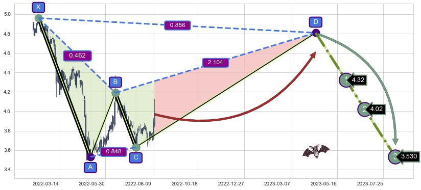 ➣ 未完成【蝙蝠】形态起点X: 2022-02-10, 已到达C点: 2022-07-15, 预测最终D点: 2023-04-13, 共300交易日