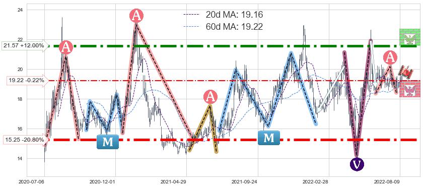 ♘ 支撑价格位19.22,可信任强度45.10%,距离最后交易2022-08-12形成的收盘价格19.26相差 -0.22%