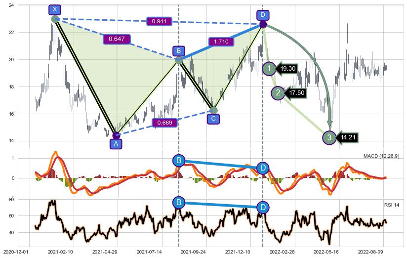 ➢ 谐波价格D点比B点高 ⤴,【MACD】指标D点比B点低 ⤵️