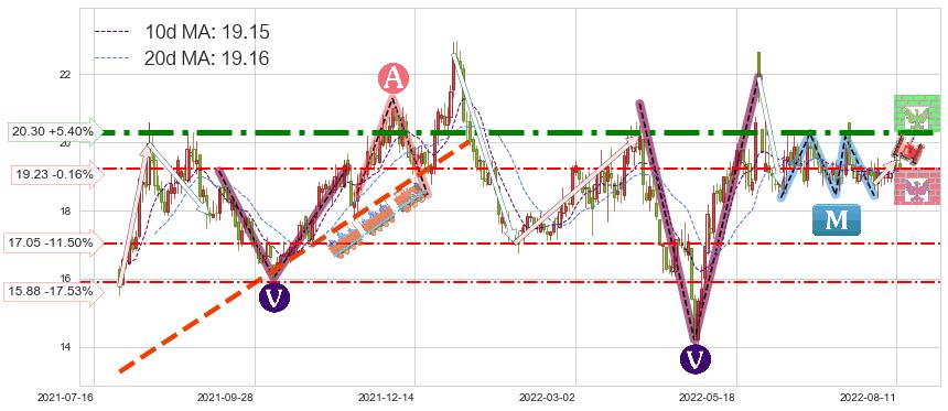 ♘ 阻力价格位20.30,可信任强度93.85%,距离最后交易2022-08-12形成的收盘价格19.26相差 +5.40%