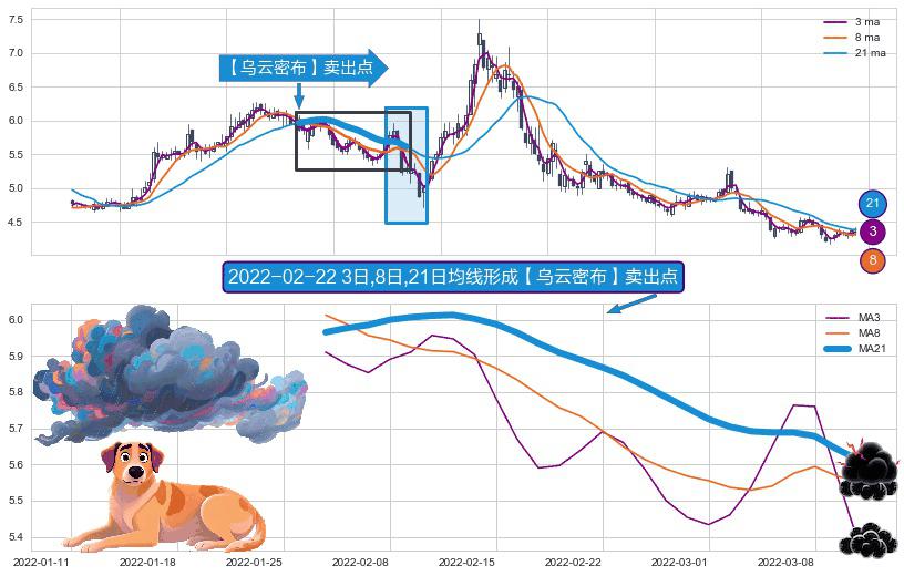 ⚀ 2022-01-27日-2022-03-10日显现 3日-8日-21日均线 【乌云密布】卖出点 看空信号,后市看跌,卖出
