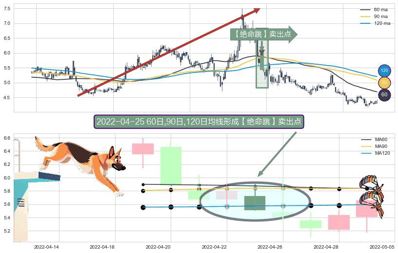 ⚀ 2022-04-25日显现 60日-90日-120日均线 【绝命跳】卖出点 看空信号,后市看跌,卖出