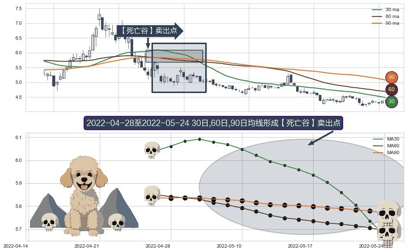 ⚀ 2022-04-29-日至2022-05-24-日显现 30日-60日-90日均线 【死亡谷】卖出点 看空信号,后市看跌,卖出