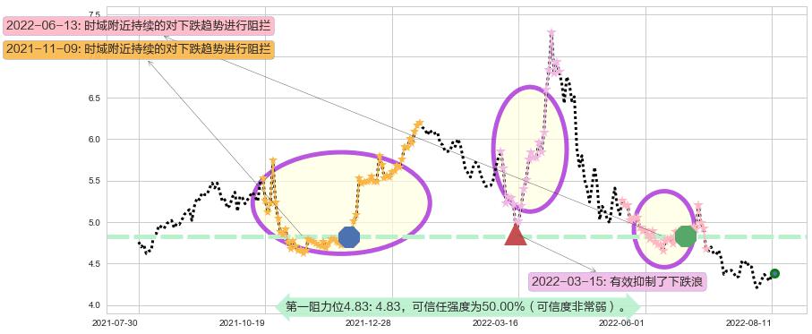 2022-06-13: 时域附近第一阻力位4.83持续的对下跌趋势进行阻拦,有效地放缓了下跌的速度。