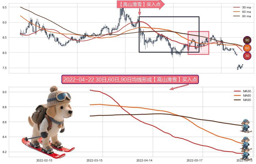 ⚀ 2022-03-08日-2022-06-09日显现 30日-60日-90日均线 【高山滑雪】买入点 看多信号,后市看涨,买入