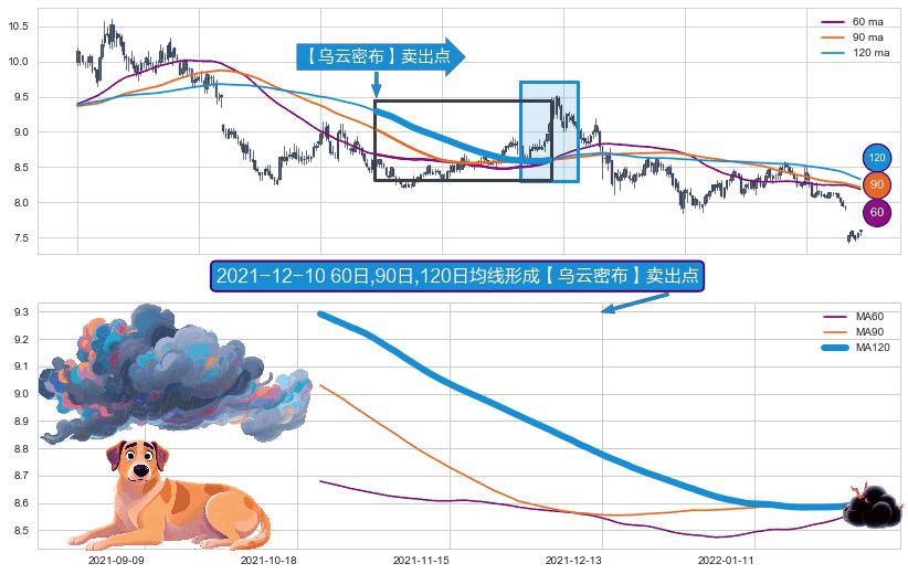⚀ 2021-10-21日-2022-02-07日显现 60日-90日-120日均线 【乌云密布】卖出点 看空信号,后市看跌,卖出