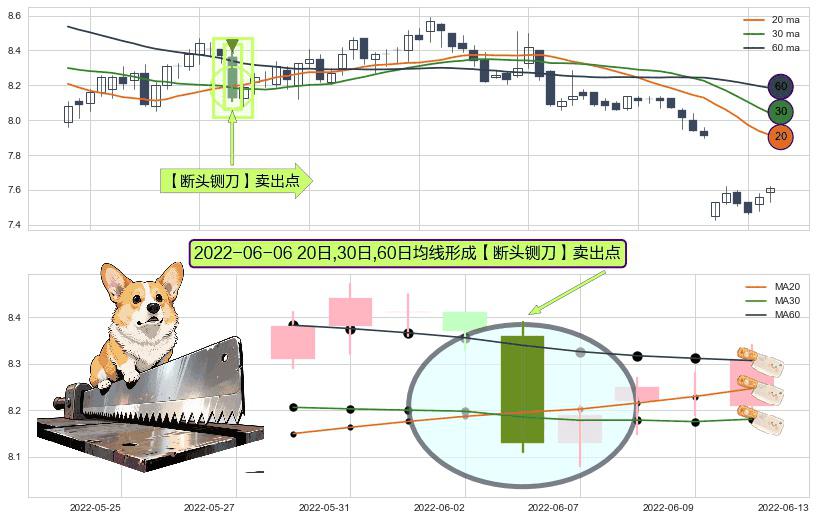 ⚀ 2022-06-06日显现 20日-30日-60日均线 【断头铡刀】卖出点 看空信号,后市看跌,卖出