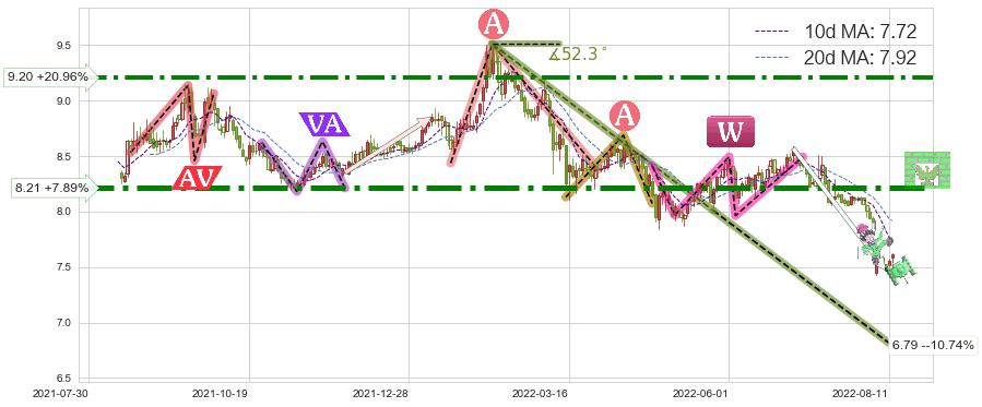 ♘ 阻力价格位8.21,可信任强度86.32%,距离最后交易2022-08-12形成的收盘价格7.61相差 +7.89%