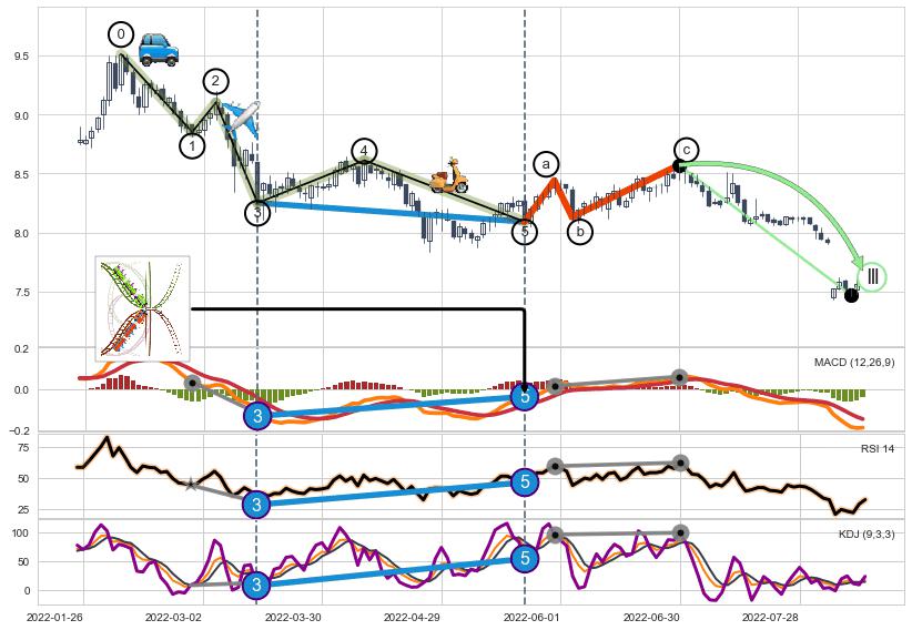 ➢ a,c调整浪MACD, RSI, KDJ走势都【未出现】背离,abc走势延续, 5浪反转概率增强