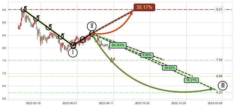 ➢ 循环浪继续向下【最低】位置(2023-03-08, 6.23),匹配聚类样本比例25.01%, 可能性概率16.21%
