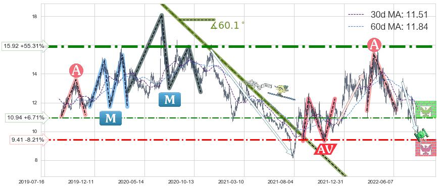 ♘ 阻力价格位10.94,可信任强度46.86%,距离最后交易2022-08-12形成的收盘价格10.25相差 +6.71%