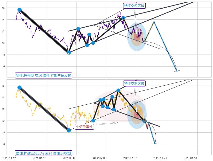 | 2 🌊:波浪理论c点反弹终止反转下跌 ➕ 📐:升楔型支撑破位转换阻力下跌 ☞ 看空信号 ⇥ 【图形】交织【图形】⇥ 综合量化分数: 34 | > |