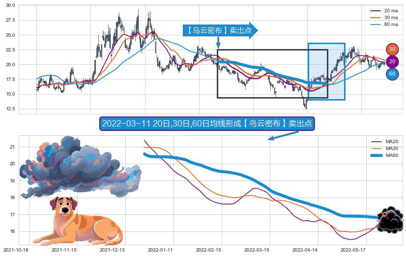 形态多维评估: ⚀ 2021-12-23日-2022-05-27日显现 20日-30日-60日均线 【乌云密布】卖出点 看空信号,后市看跌,卖出