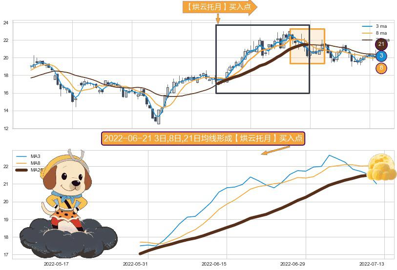 形态多维评估: ⚀ 2022-05-30日-2022-07-12日显现 3日-8日-21日均线 【烘云托月】买入点 看多信号,后市看涨,买入