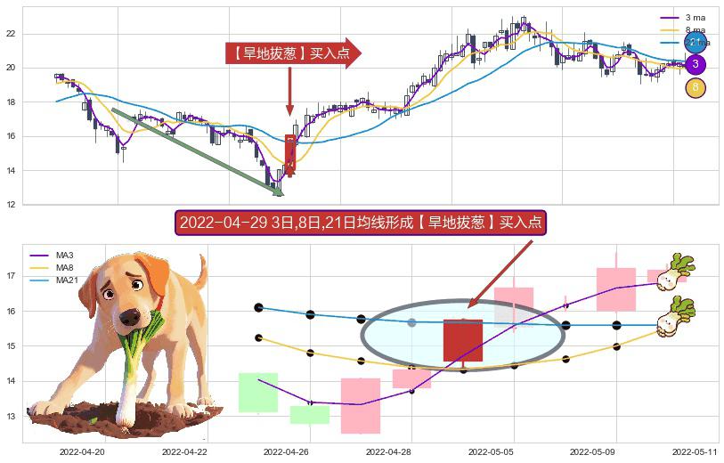 形态多维评估: ⚀ 2022-04-29日显现 3日-8日-21日均线 【旱地拔葱】买入点 看多信号,后市看涨,买入