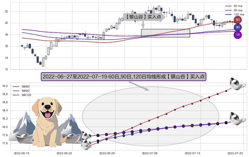 形态多维评估: ⚀ 2022-06-28-日至2022-07-19-日显现 60日-90日-120日均线 【银山谷】买入点 看多信号,后市看涨,买入