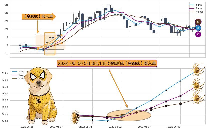 形态多维评估: ⚀ 2022-06-06日显现 5日-8日-13日均线 【金蜘蛛】买入点 看多信号,后市看涨,买入
