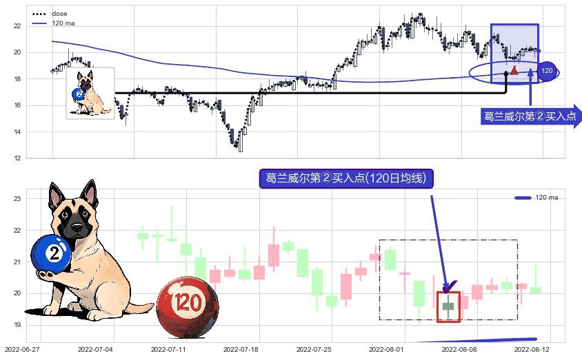 形态多维评估: ⚀ 2022-08-04-日显现 葛兰威尔均线 120日均线 第②买入点 上升趋势的中继信号,后市看涨,买进信号