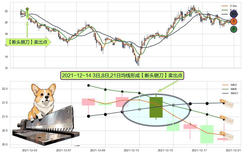 形态多维评估: ⚀ 2021-12-14日显现 3日-8日-21日均线 【断头铡刀】卖出点 看空信号,后市看跌,卖出
