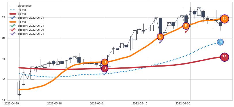 上涨趋势2022-04-29-2022-07-11,均线75, 13确认关键支撑3处