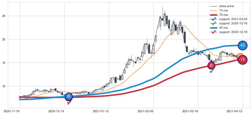 上涨趋势2020-11-16-2021-04-12,均线75, 45确认关键支撑2处