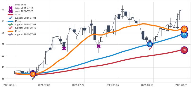 上涨趋势2021-06-24-2021-08-31,均线13, 75, 45确认关键支撑2处
