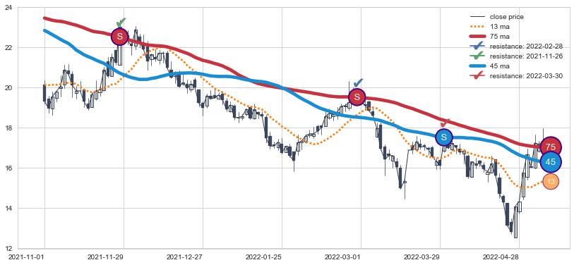 下跌趋势2021-11-01-2022-05-11,均线75, 45确认关键阻力3处